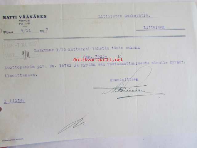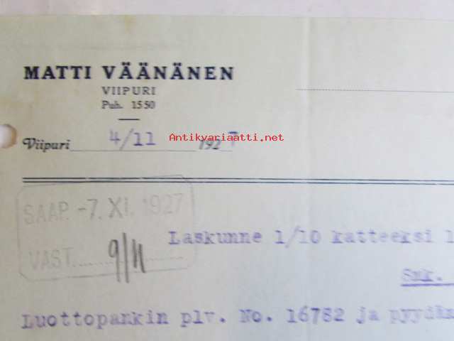 Matti Väänänen Viipuri 4/11 1927 -asiakirja