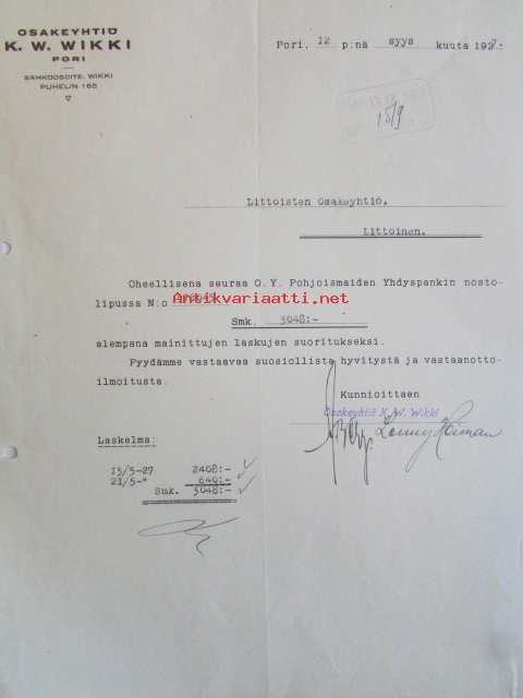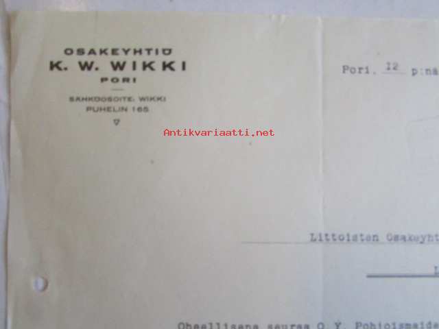 Osakeyhtiö K.W. Wikki, Pori 12. syyskuuta 1927 -asiakirja