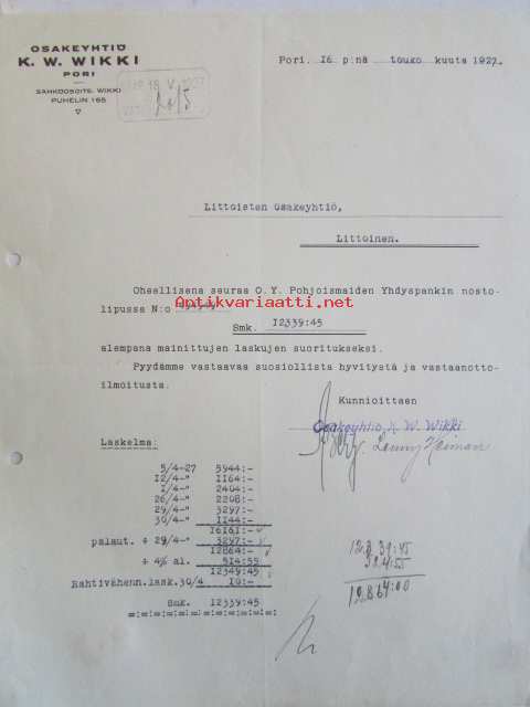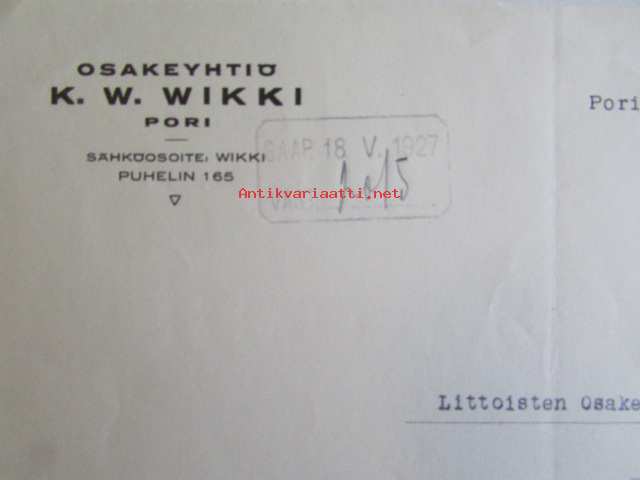 Osakeyhtiö K.W. Wikki, Pori 16. toukokuuta 1927 -asiakirja