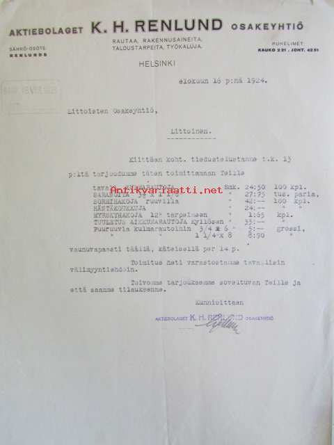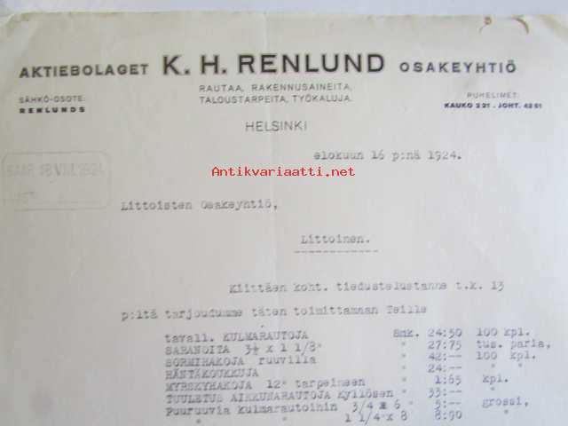 Aktiebolag K.H. Renlund Osakeyhtiö, Helsinki elokuun 16. 1924 -asiakirja