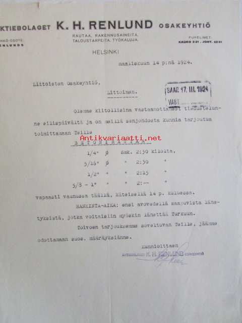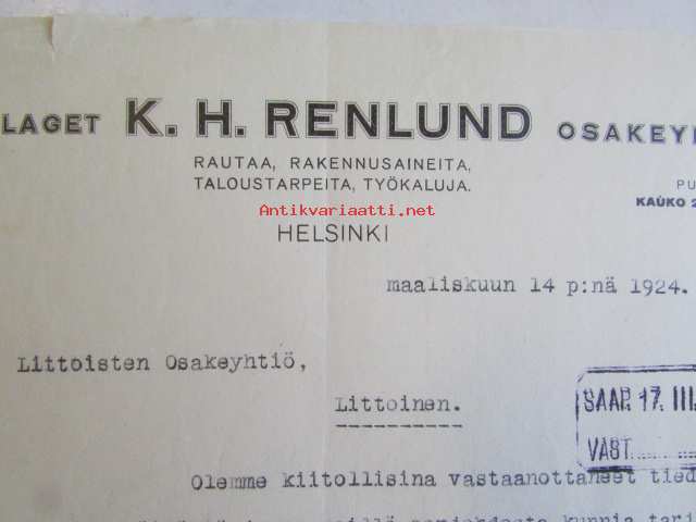 Aktiebolag K.H. Renlund Osakeyhtiö, Helsinki maaliskuun 14. 1924 -asiakirja
