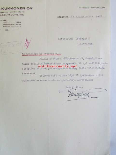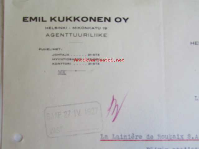 Emil Kukkonen Oy Agenttuuriliike, Helsinki 26. huhtikuuta 1927 -asiakirja