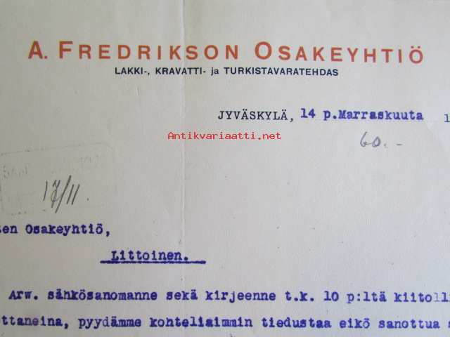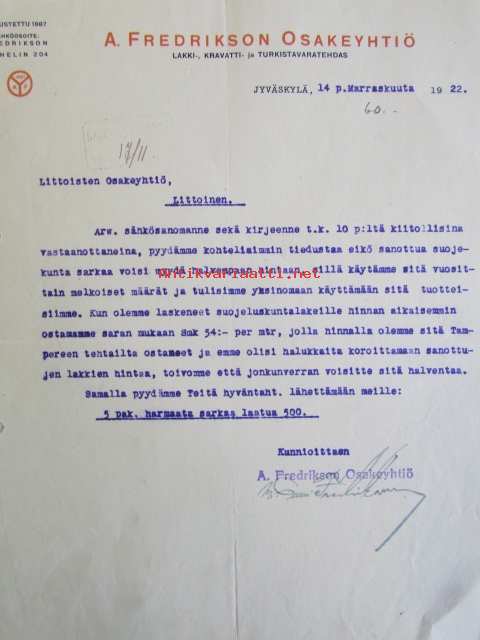 A. Fredrikson Osakeyhtiö, Jyväskylä 14. marraskuuta 1922 -asiakirja