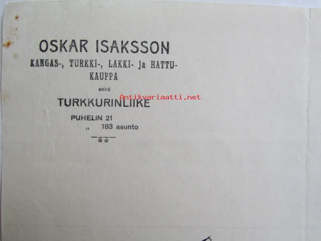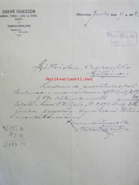 Oscar Isaksson Kangas-turkki-lakki-hattukauppa, Hämeenlinna joulukuun 9 1922. -asiakirja