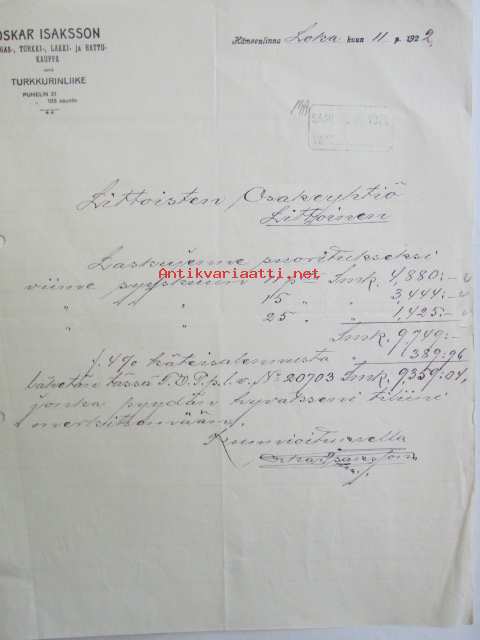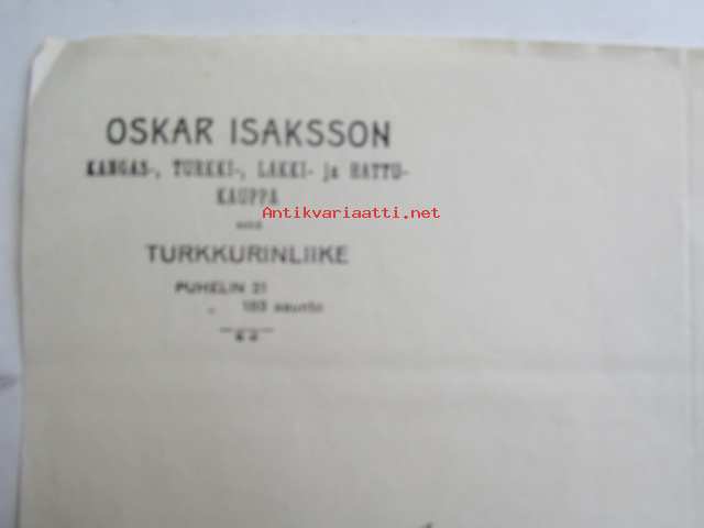 Oscar Isaksson Kangas-turkki-lakki-hattukauppa, Hämeenlinna lokakuun 11. 1922. -asiakirja