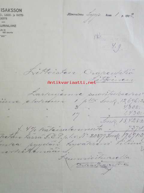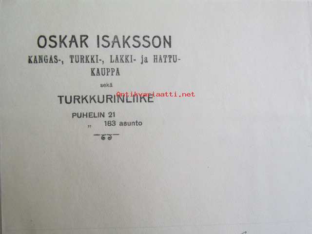 Oscar Isaksson Kangas-turkki-lakki-hattukauppa, Hämeenlinna syyskuun 1. 1922. -asiakirja