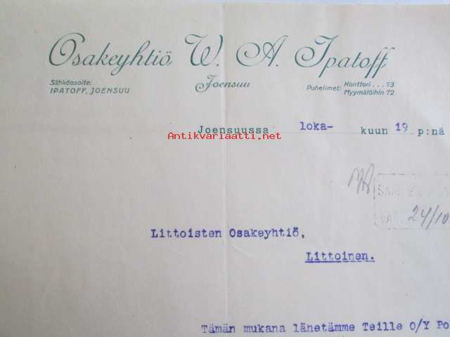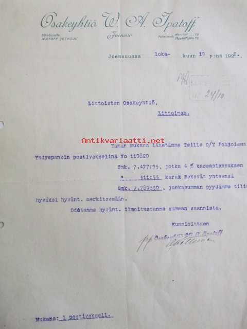 Osakeyhtiö W. A. Ipatoff, Joensuussa lokakuun 19.. 1922. -asiakirja