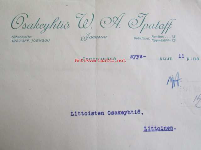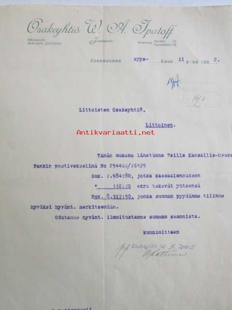 Osakeyhtiö W. A. Ipatoff, Joensuussa syyskuun 11. 1922. -asiakirja