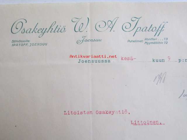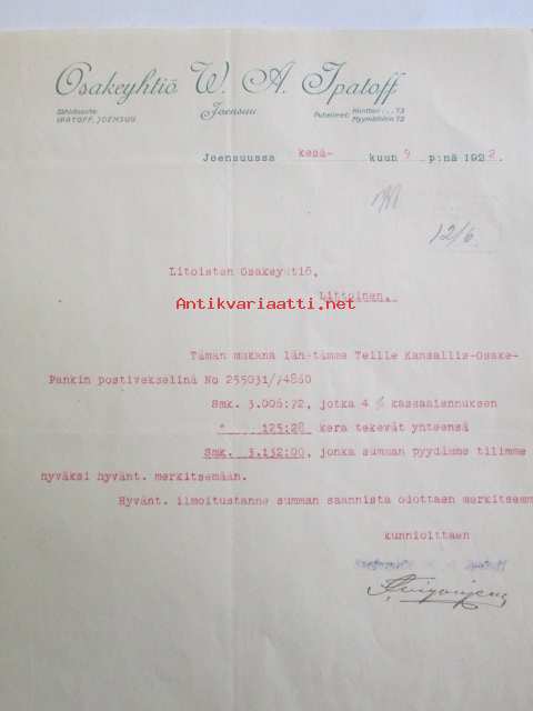 Osakeyhtiö W. A. Ipatoff, Joensuussa kesäkuun 9. 1922. -asiakirja