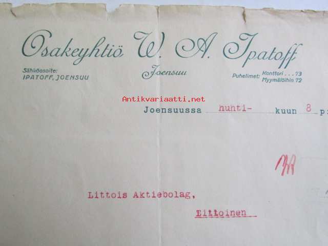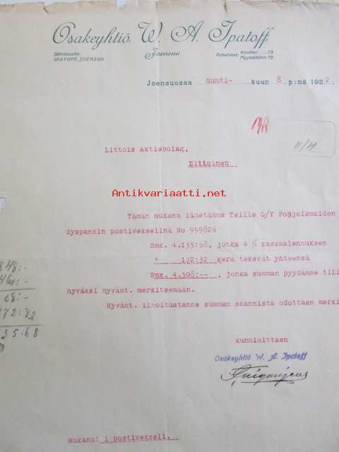Osakeyhtiö W. A. Ipatoff, Joensuussa huhtikuun 8. 1922. -asiakirja