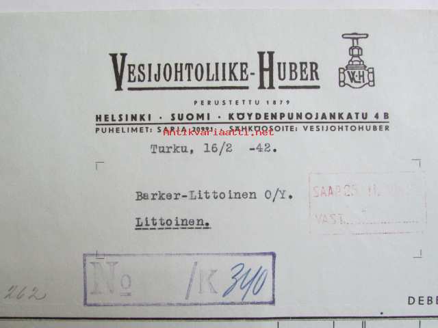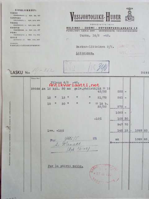 Vesijohtoliike-Huber, Turku 16/2 1942. -asiakirja