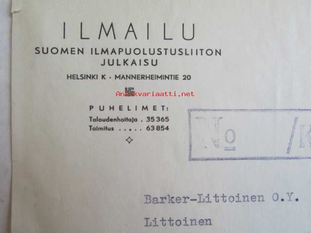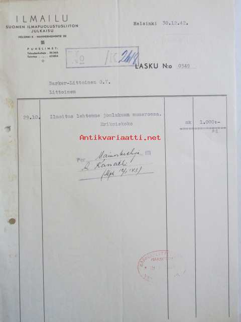 Ilmailu, Suomen ilmapuolustusliiton julkaisu, Helsinki 30.12. 1942. -asiakirja