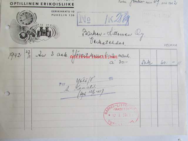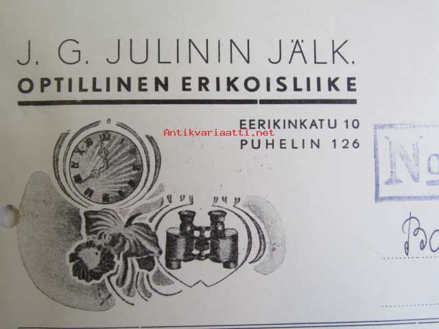J.G. Julinin Jälk. Optillinen erikoisliike, Turussa joulukuun 29. 1942. -asiakirja