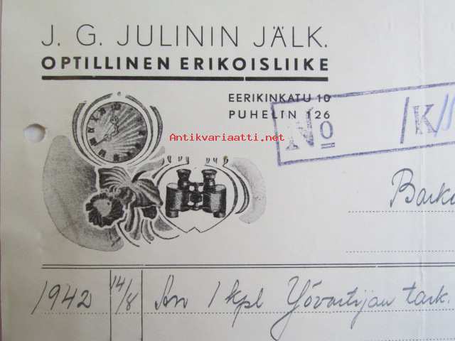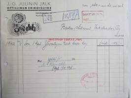 J.G. Julinin Jälk. Optillinen erikoisliike, Turussa elokuun 20. 1942. -asiakirja