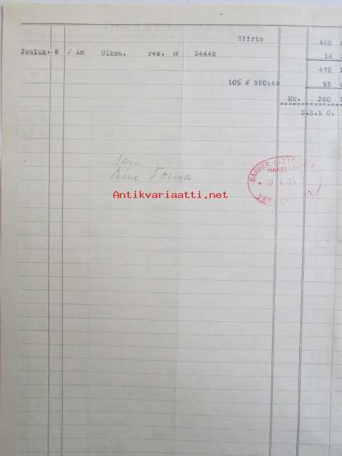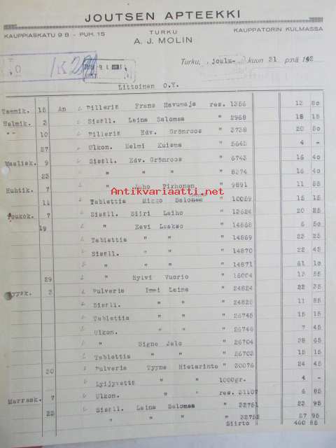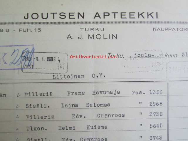 Joutsen Apteekki, Turku joulukuun 31. 1942. -asiakirja