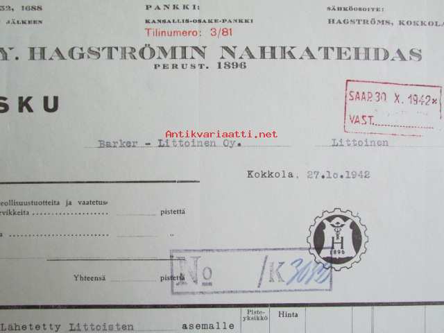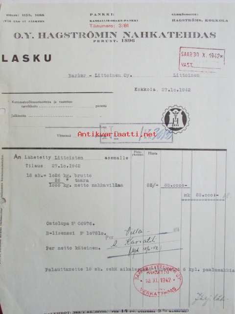Oy Hagströmin Nahkatehdas, Kokkola 27.10. 1942. -asiakirja