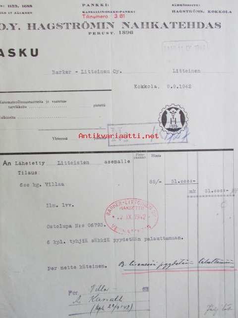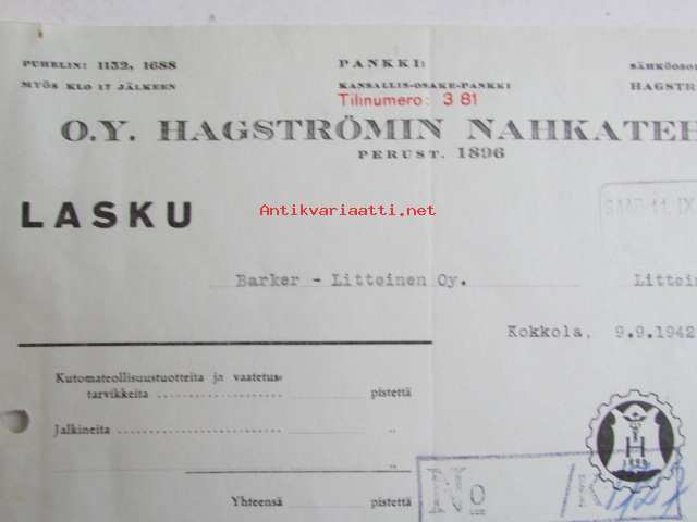 Oy Hagströmin Nahkatehdas, Kokkola 9.9. 1942. -asiakirja