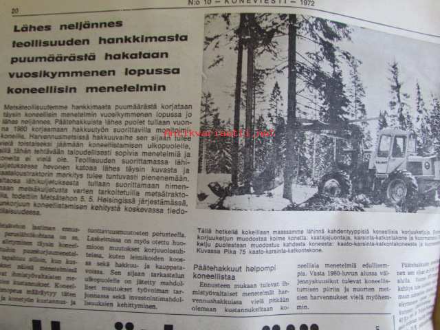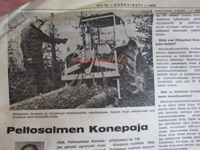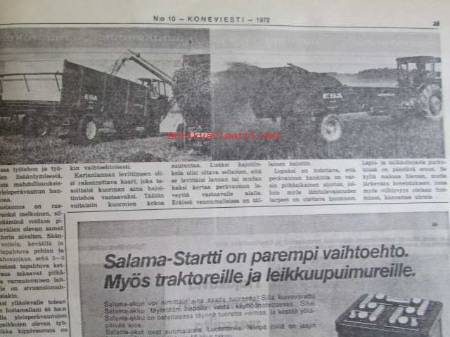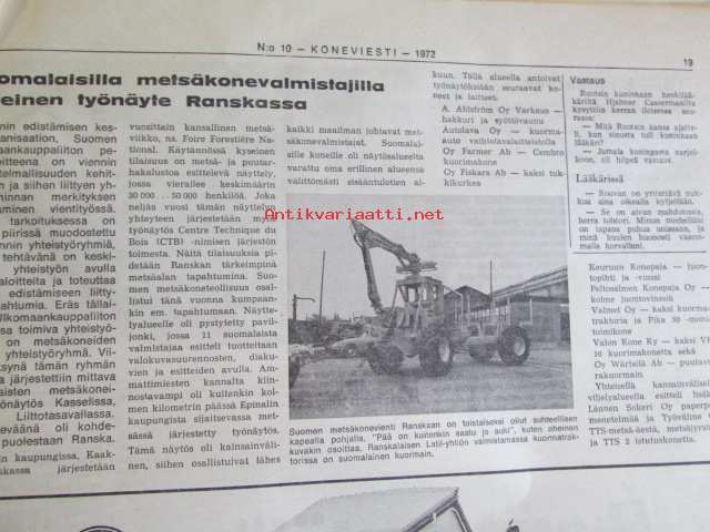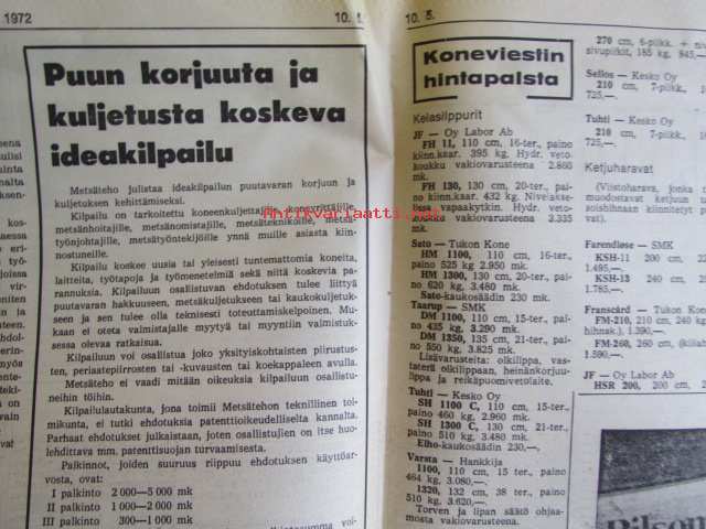 Koneviestin Ammattilehdet Oy, 1972Koneviesti 1972 nr 10 -mm. Pohjoismaista maatalous- ja metsäkoneteollisuutta II Suomi, Ford 5000 KV:n traktoritestissä, Viljavuuspalvelu, Tuottaisinko naudanlihaa, Lisäystä kevättyökoneisiin, Kokeilimme moottorisahoja Partner R 19 Thyristor, Neljännes teollisuuden puumäärästä korjataan koneellisesti v. 1980, Perämoottorit, Lada - laatuauto vai?, Hajakuvia HAnnoverin messuilla, Tela-alustan huolta, Hydrauliikan perusteet, Keskimaata se on Mäntyharju.
