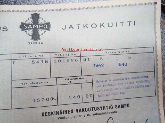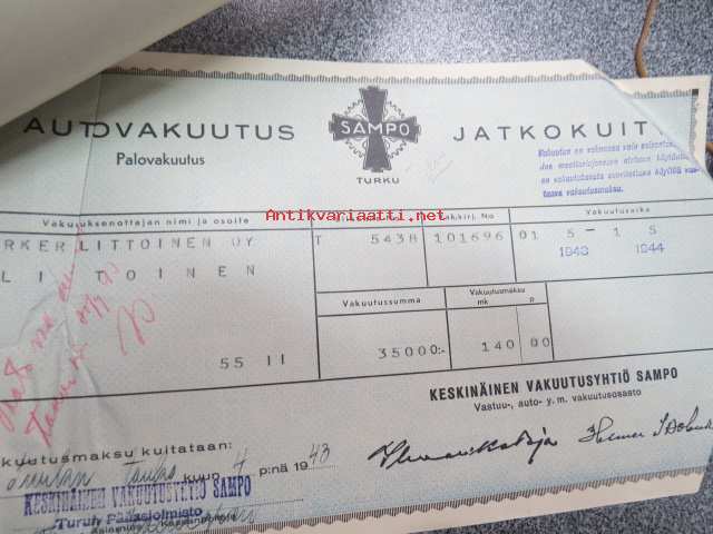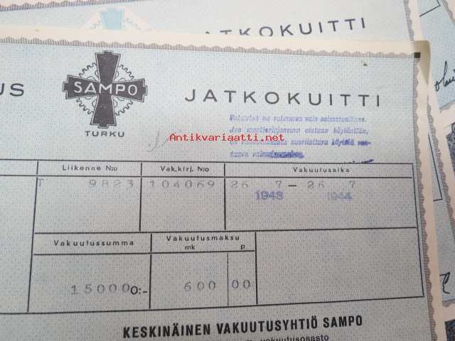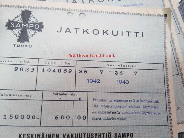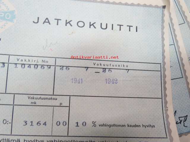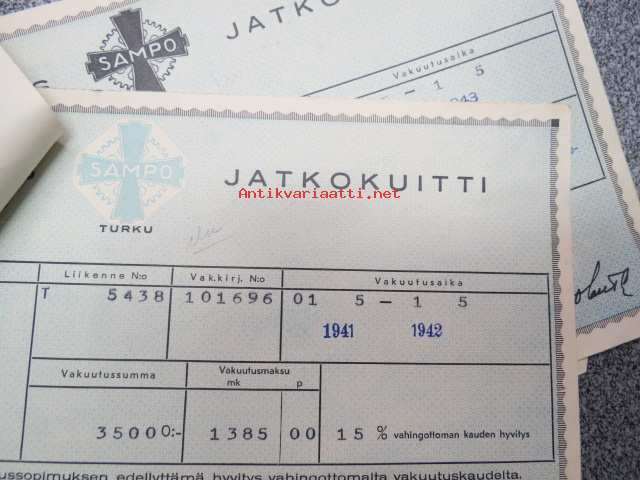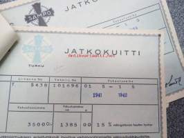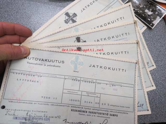 Sampo autovakuutus / vaunuvahinko- ja palovakuutus / Littoinen Oy - jatkokuitteja vv. 1941-44 6 kpl