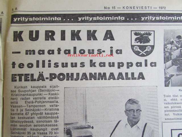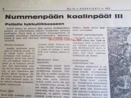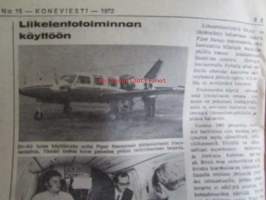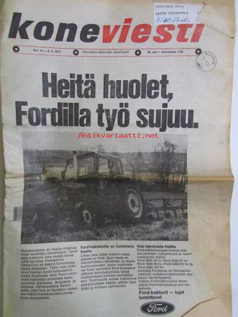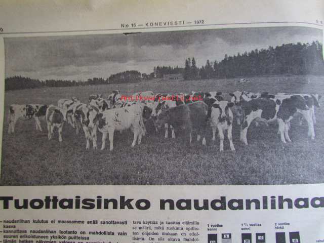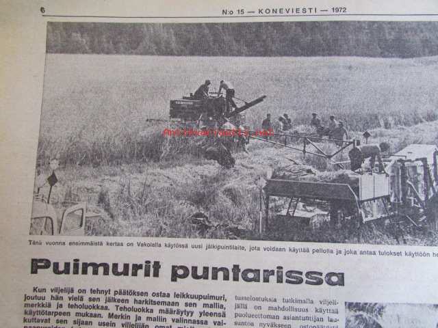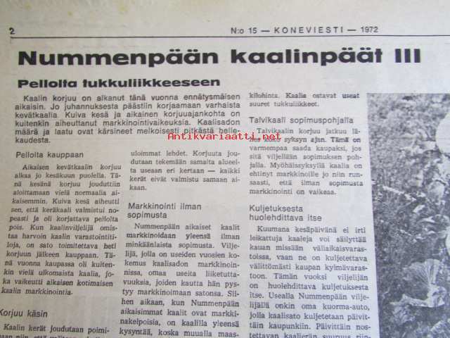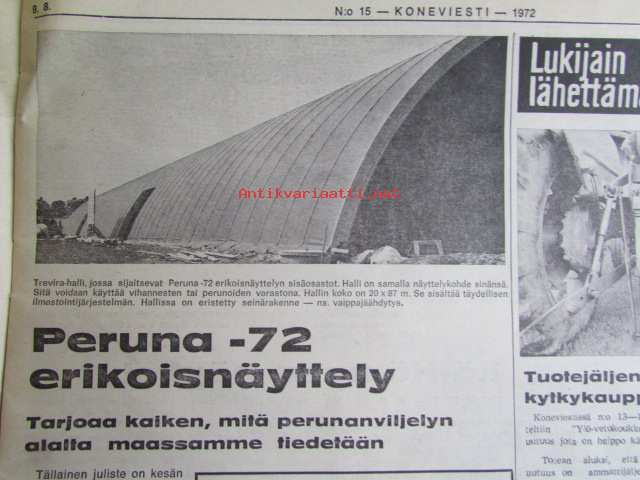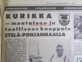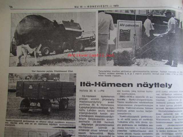 Koneviestin Ammattilehdet Oy, 1972Koneviesti 1972 nr 15 -mm. Fiskarsin Agromat-aura KV:n testissä, Puimurit puntarissa, Näkymiä farmilta Englannista, JCB tehoa ja tuottavuutta kaivureitten valmistuksessa, Hydrauliikan perusteet IX, Tuottaisinko naudanlihaa, Peruna-72 erikoisnäyttely, Ajanmukainen kalusto ja pätevät opettajat Hirvaalla, Metsänhoito- ja perusparannustöistä vuonna -72, Varastoitua voimaa, Kurikka maatalous- ja teollisuuskauppala.