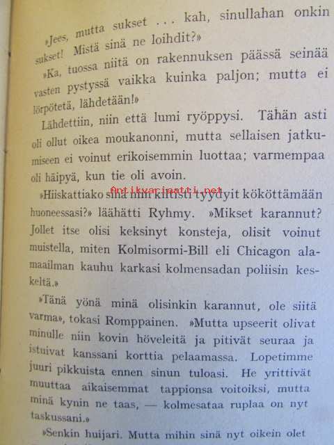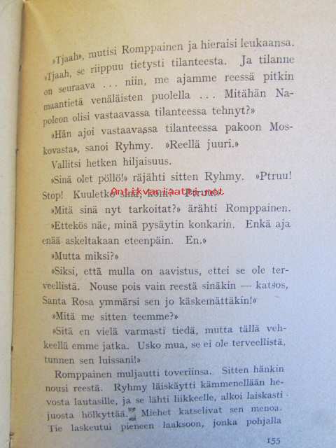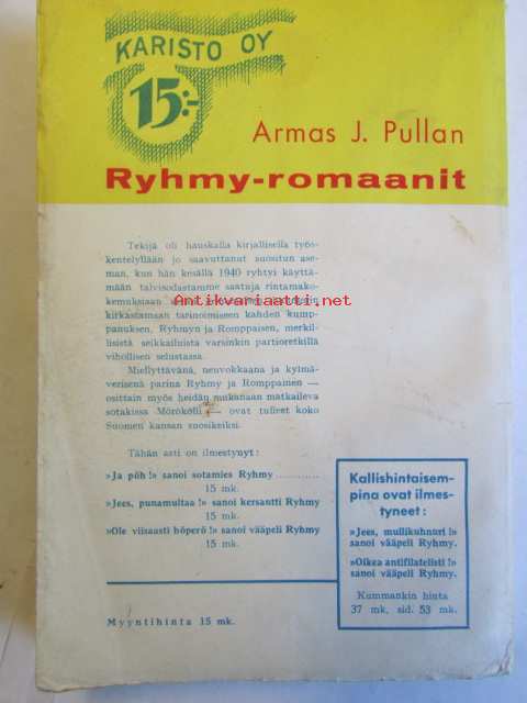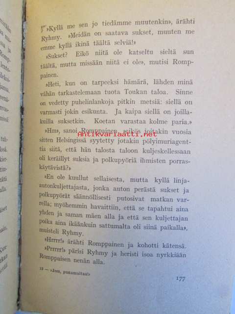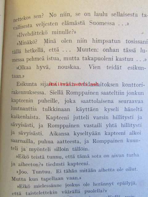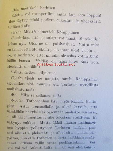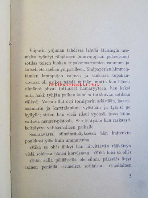 | Saatavilla | 1 kpl | | Julkaisuvuosi | 1942 | | Sivuja | 193 | | Painos | 5. | | Kunto | K2 | | Sidonta/painoasu | Nidottu (pehmeäk.) | | ISBN | 951-23-0799-5 | | Kielet | Suomi |
