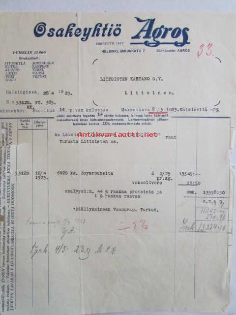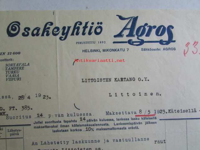 Osakeyhtiö Agros, Helsinki 28/4. 1923. -asiakirja