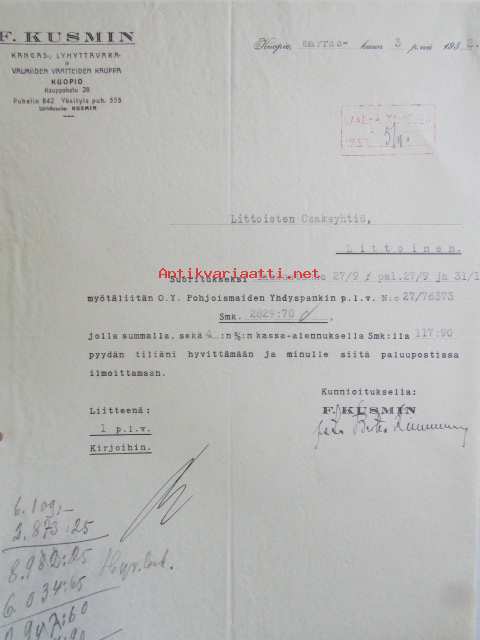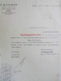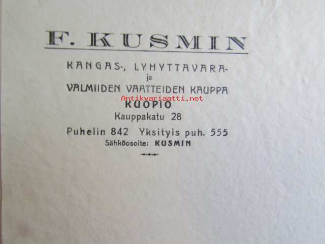 F.Kusmin kangas - lyhyttavara, Kuopio marraskuun 3. 1932 - asiakirja