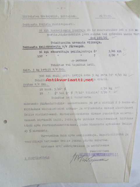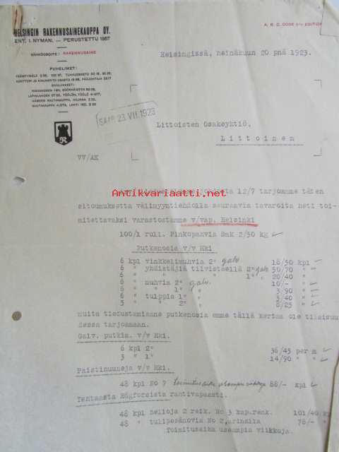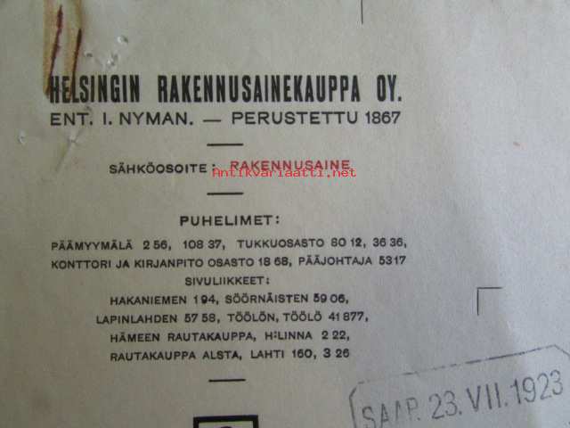 Helsingin Rakennusainekauppa Oy, Helsingissä heinäkuunn 20. 1923. - asiakirja
