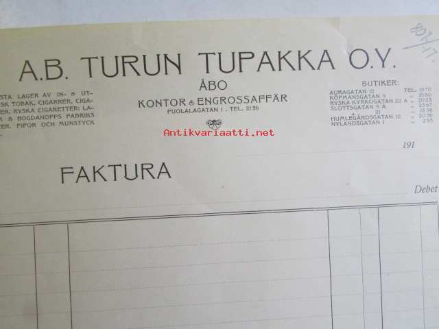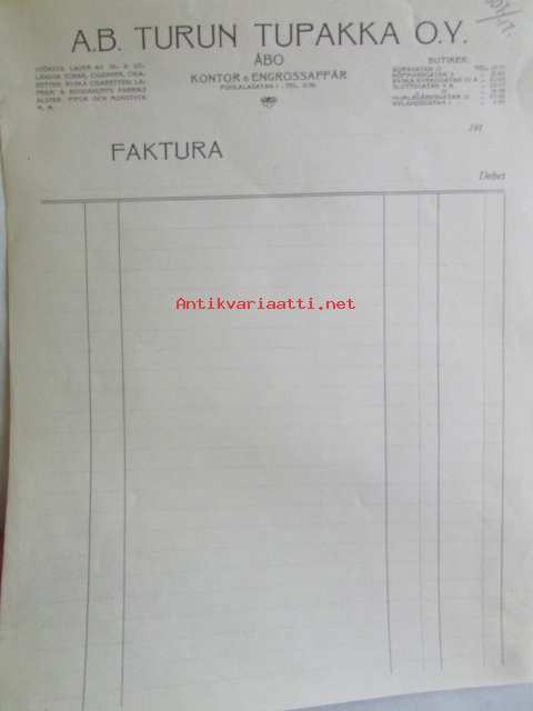 Ab. Turun Tupakka Oy Åbo Kontor & Engrossaffär -Firman lomake