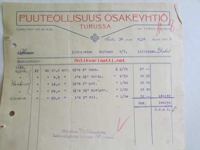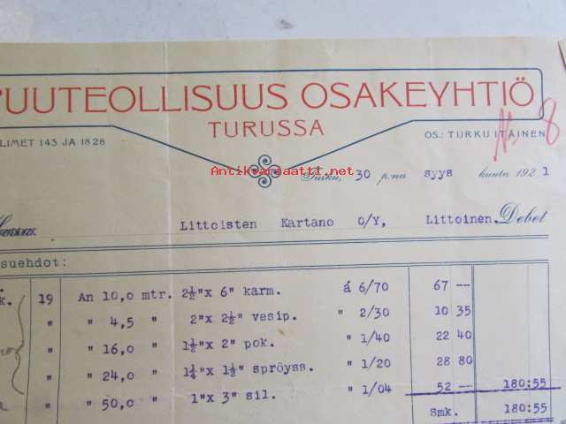 Puuteollisuus Osakeyhtiö Turussa, Turku 30. syyskuuta 1921. - asiakirja