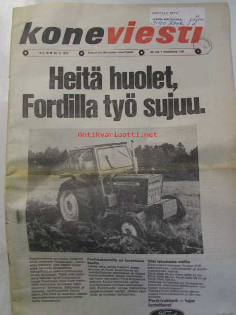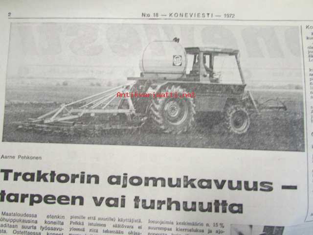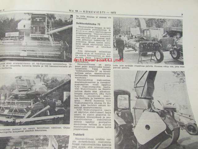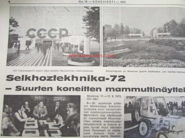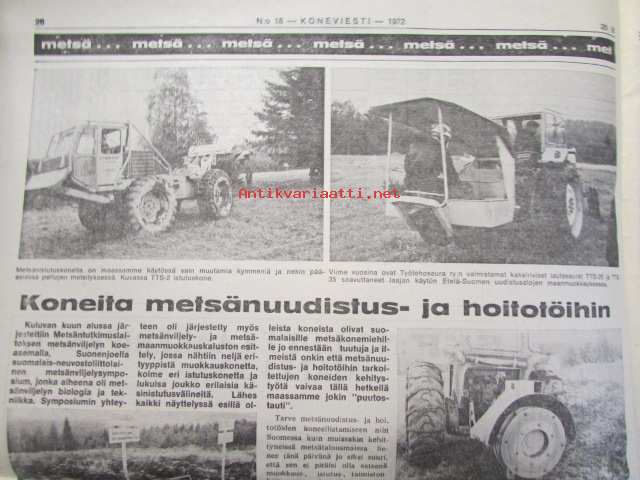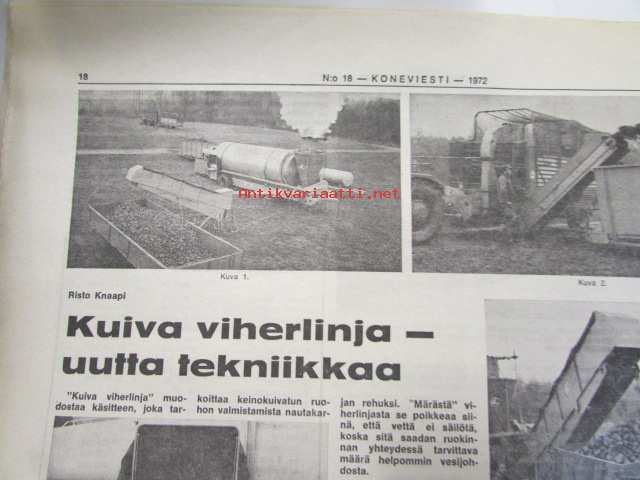 Koneviestin Ammattilehdet Oy, 1972Koneviesti 1972 nr 18 -mm. Selkhozteknika -72, Kuiva viherlinja, Perävaunu maatilan työkone, Turpeessa sen salaisuus, Karjatilöa lännen malliin, Vakolan koetusselotus Ford County 754, Metsäsienet lisäansioina, Hydrauliikan perusteet X, Tuulilasin pesunesteet testattuna tulokset heikkoja, Kaasuhitsaus IX, Maxpo 72, Juolavehnä tapetaa syksyllä, Vierailu Minskissä, Koneita Metsänuudistus- ja hoitotöihin.