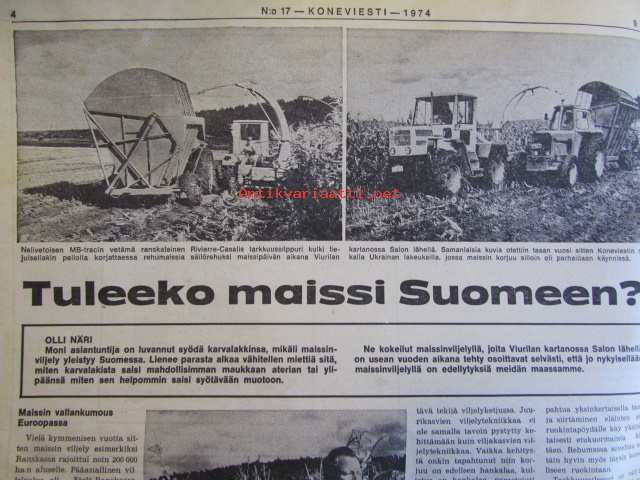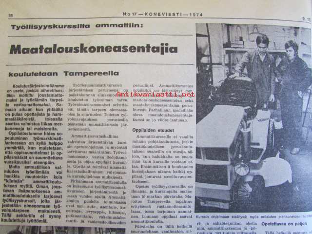 Koneviesti 1974 nr 17 -mm. Tuleeko maissi Suomeen, Kyntömestarit 1974, Maatalouskoneasentajia koulutetaan, Metsätraktorit 1974, Tuloksia kokopuuhaketuksista,