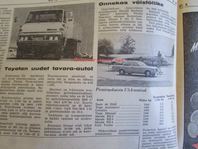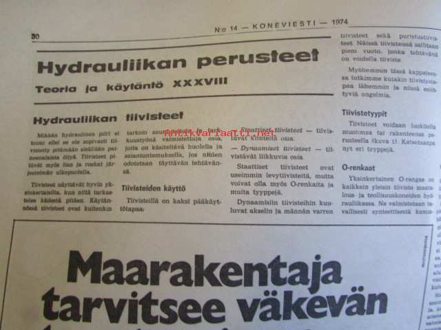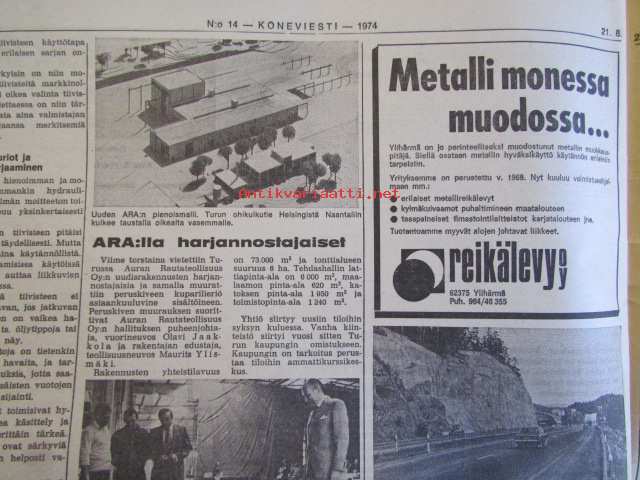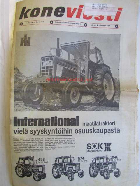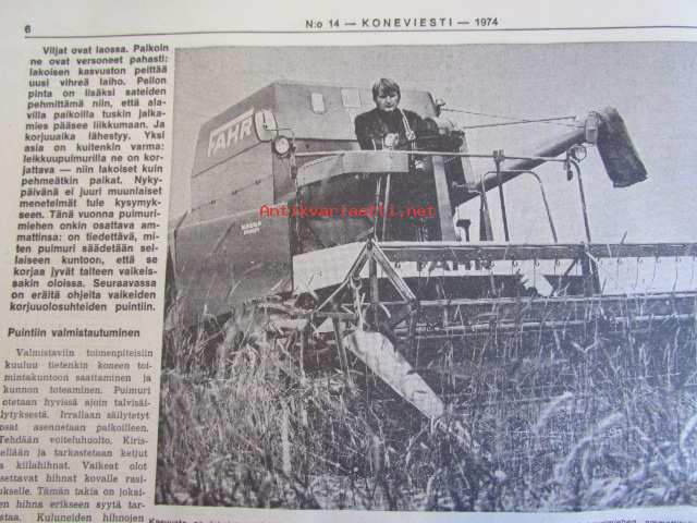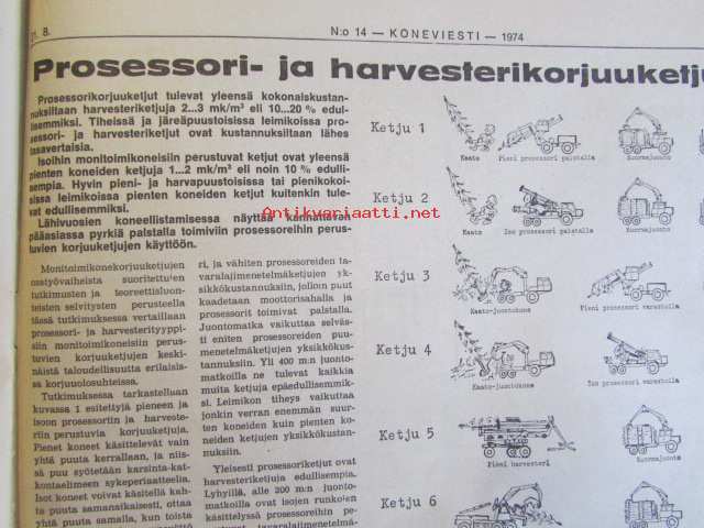 Koneviestin Ammattilehdet Oy, 1974Koneviesti 1974 nr 14 -mm. Puimurisuunnittelijan puheenvuoro, Lakoviljan puinti, Kuivurin kunnostus, Maatalouskaupan puheenvuoro, Tuorerehu muovisäkkiin, Traktoriaurat ja hintapalstat, International 474 Vakolan koetusselostus, Kannattaako metsälannoitus, Puutavara-autot järeämmäksi, Prosessori- ja harvesteriketjut, Hydrauliikan perusteet, Mailta teiltä ja vesiltä.