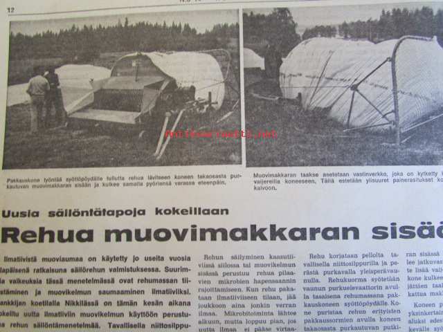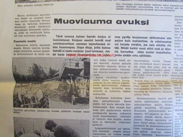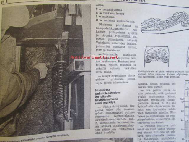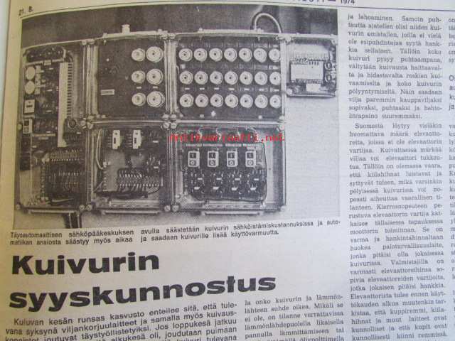 Koneviesti 1974 nr 14 -mm. Puimurisuunnittelijan puheenvuoro, Lakoviljan puinti, Kuivurin kunnostus, Maatalouskaupan puheenvuoro, Tuorerehu muovisäkkiin,