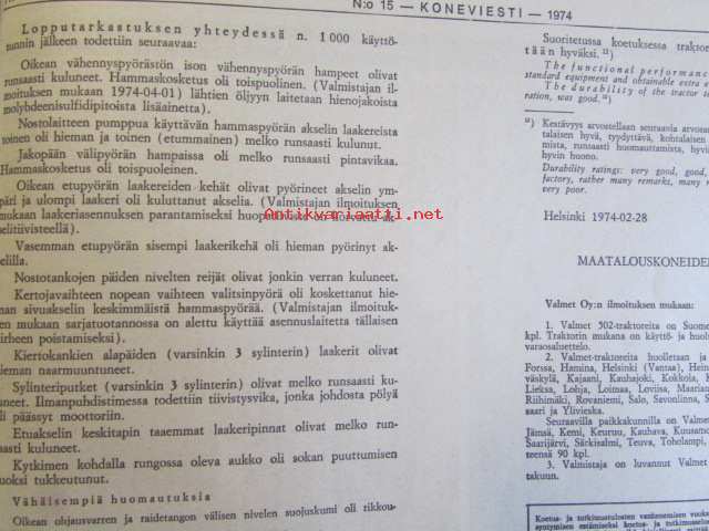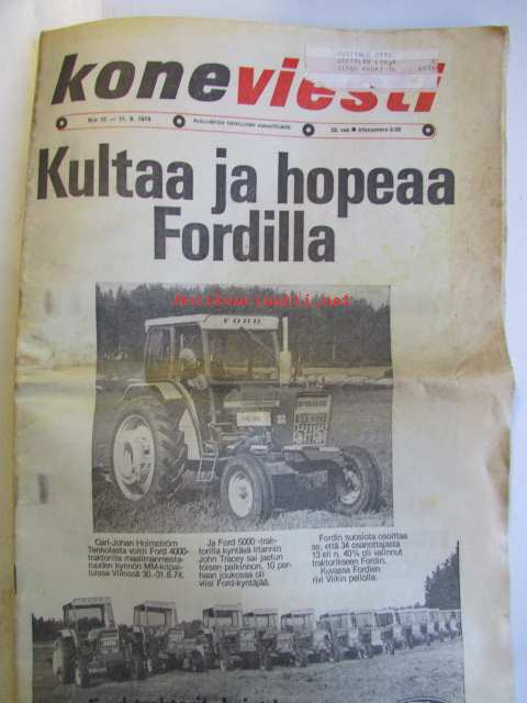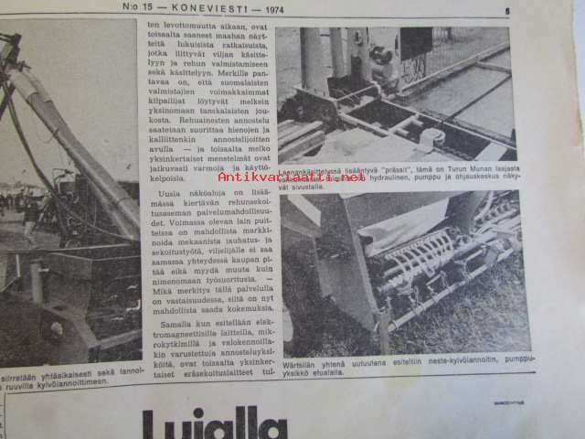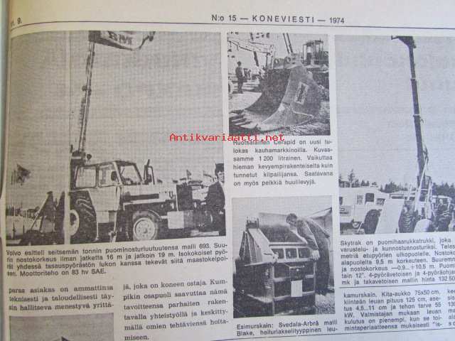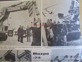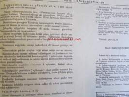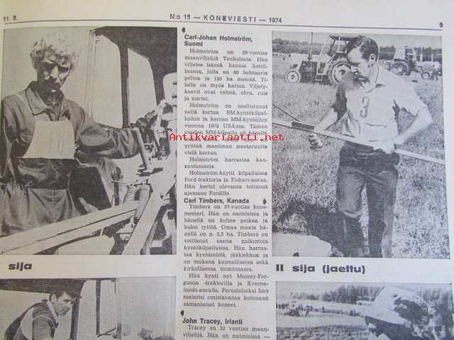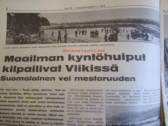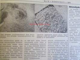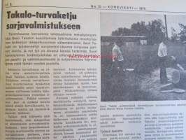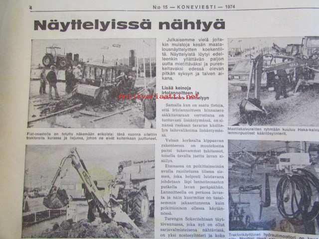 Koneviestin Ammattilehdet Oy, 1974Koneviesti 1974 nr 15 -mm. Näyttelyissä nähtyä, Maailman kyntöhuiput Viikissä, Vaihtelua viljelykiertoon, Kotitarvemyllyjä, Tuoresäilötyn viljan valmistamisessa, Märkäsäilöntä säästää selvää rahaa, Keräkaalikone, Uudet isot Ekengårdit, Lokomo Harvester, Kantojen korjuu, Harvennushakkuu koneellistuu, Maxpo -74, Takalo - Turvaketju, Kuljettajakoulutus ja työturvallisuus.