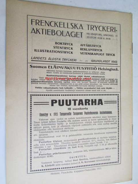| Saatavilla | 1 kpl | | Julkaisuvuosi | 1915 | | Sivuja | 24 | | Kunto | K3 | | Sidonta/painoasu | Lehti | | Kielet | Suomi |