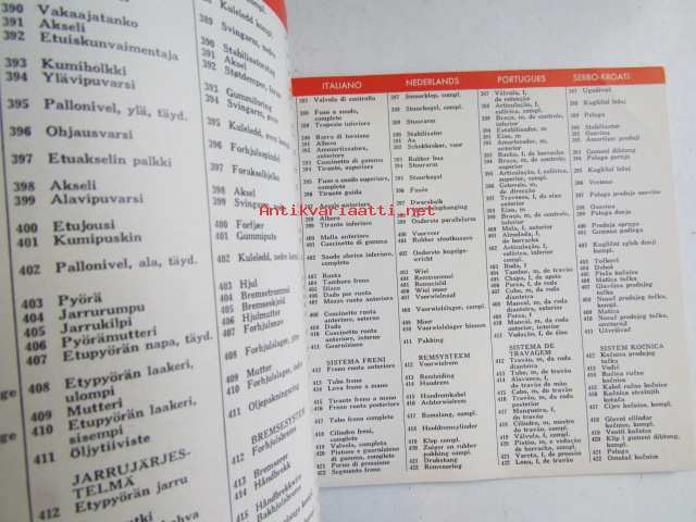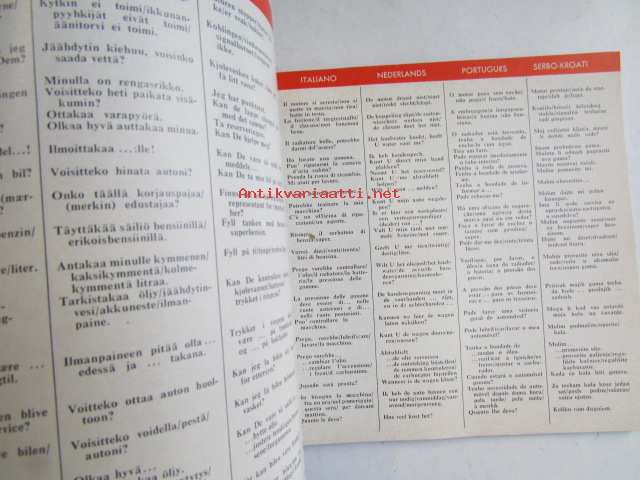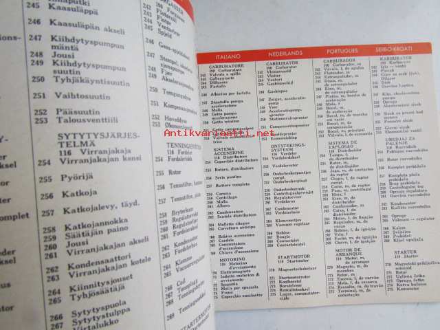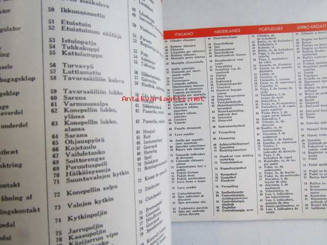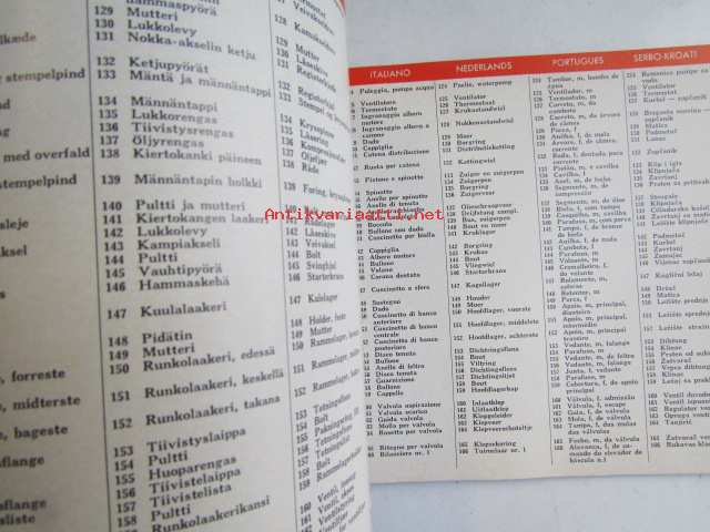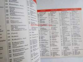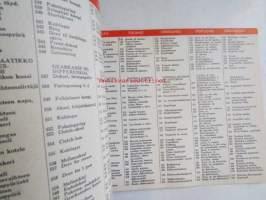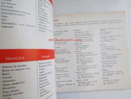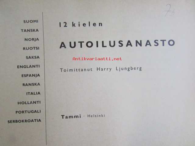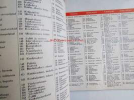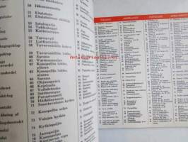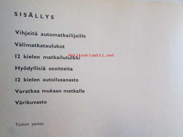 | Saatavilla | 1 kpl | | Julkaisuvuosi | 1963 | | Painos | 2. | | Kunto | K3 | | Sidonta/painoasu | Nidottu (pehmeäk.) | | Kielet | Suomi, Ruotsi, Norja, Saksa, Tanska, Ranska, Englanti, Italia, Espanja, Hollanti, Portugali |
