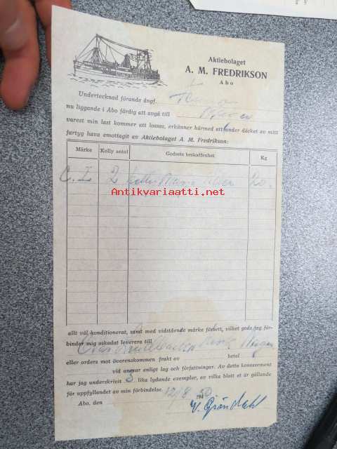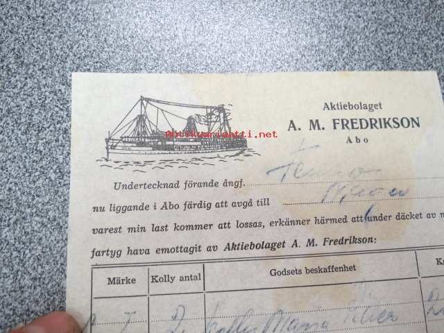 Höyrylaiva "Fenno" Turku-Nauvo 12.8.1950 -konossomentti