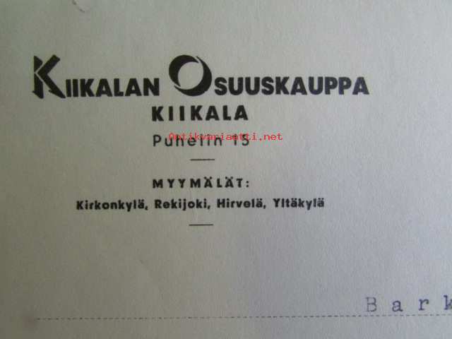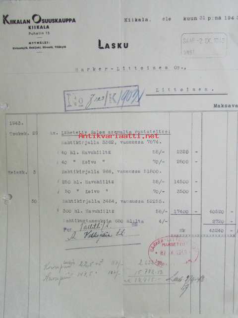 Kiikalan Osuuskauppa, Kiikala elokuun 31. 1943. - asiakirja