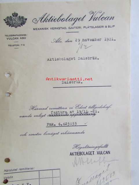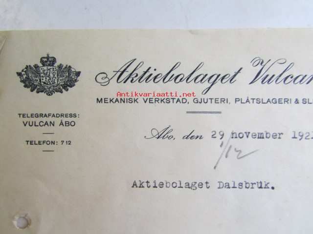 Aktiebolaget Vulcan Mekanisk verkstad Gjuteri Plåtslageri & slip, 29. november 1921. - asiakirja