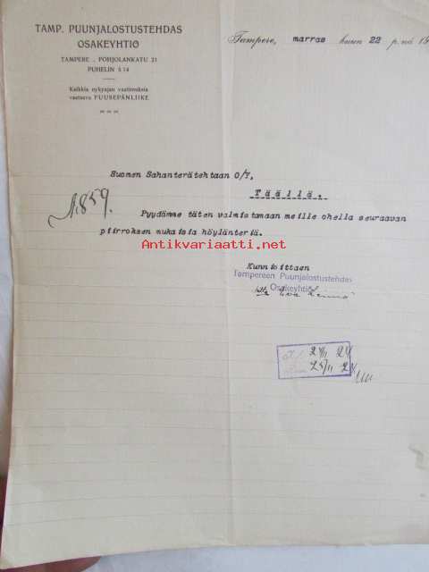 Tamp. Puunjalostustehdas osakeyhtiö, marraskuun 22. 1924. - asiakirja