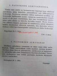 | Saatavilla | 1 kpl | | Julkaisuvuosi | 1966 | | Sivuja | 112 | | Painos | 4. | | Kunto | K3 | | Sidonta/painoasu | Nidottu (pehmeäk.) | | Kielet | Suomi |