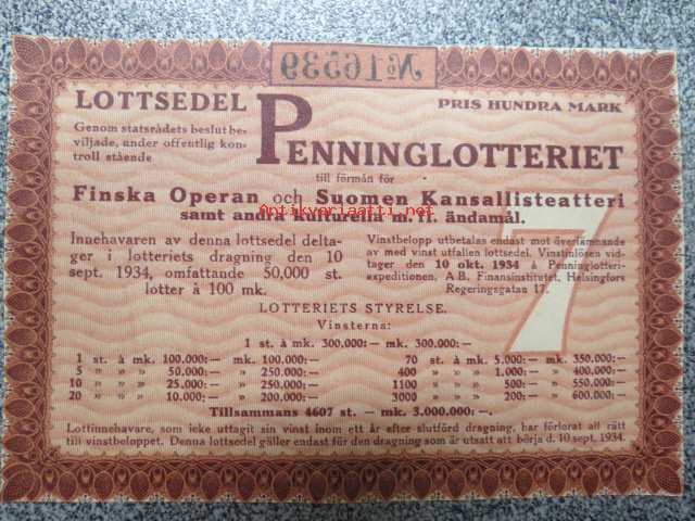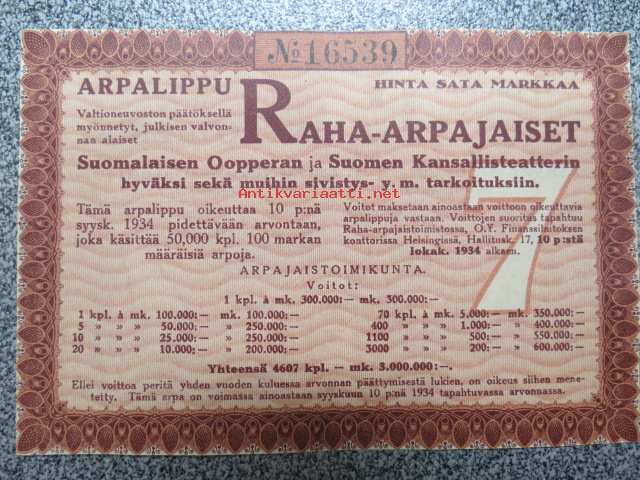 Raha-arpa, Raha-arpajaiset syyskuu 1934 nr 16539