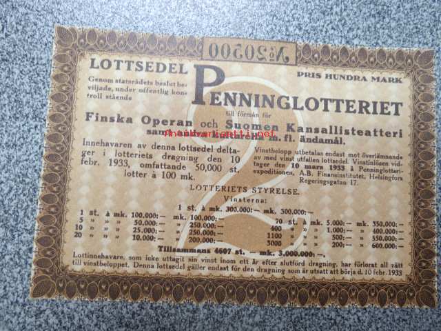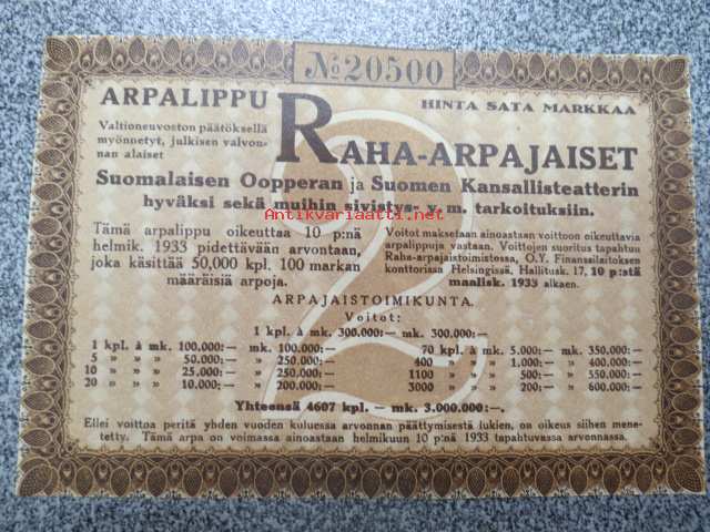 Raha-arpa, Raha-arpajaiset tammikuu 1933 nr 20500