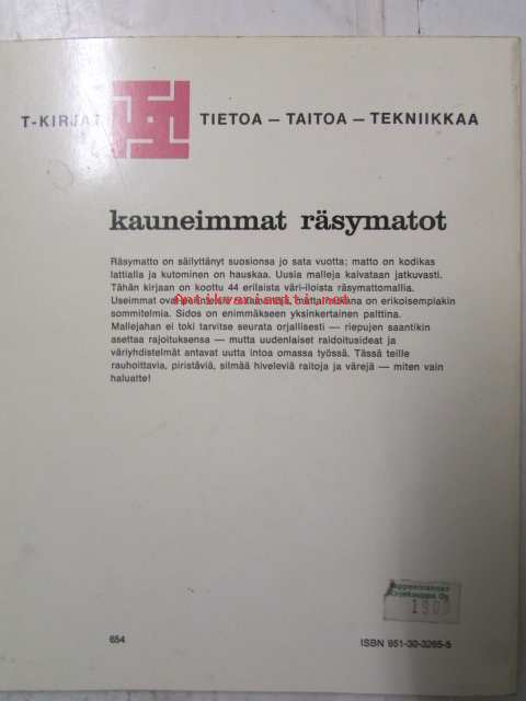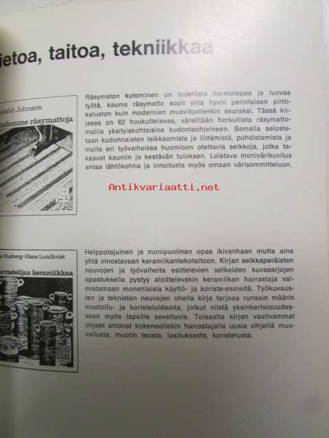| Saatavilla | 1 kpl | | Julkaisuvuosi | 1975 | | Sivuja | 81 | | Painos | 1 | | Kunto | K2 | | Sidonta/painoasu | Nidottu (pehmeäk.) | | ISBN | 951-30-3265-5 | | Kielet | Suomi |