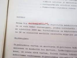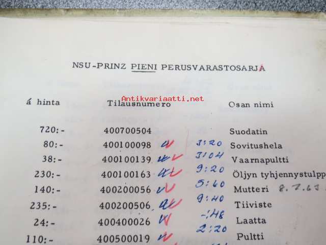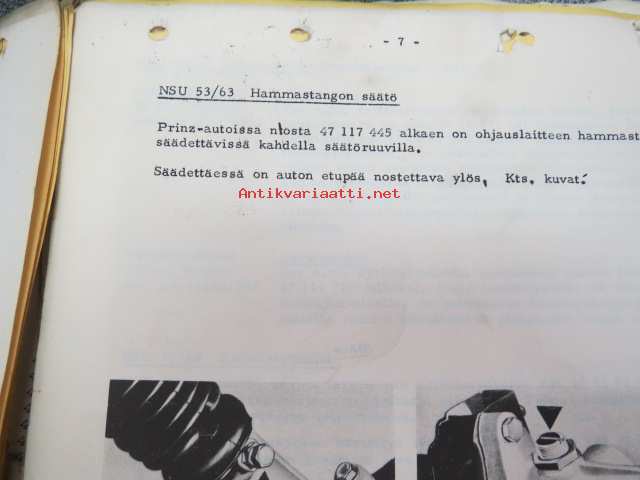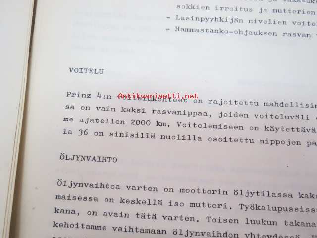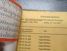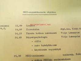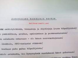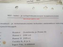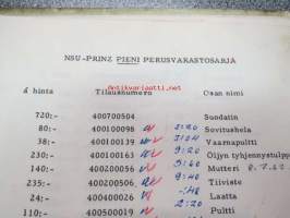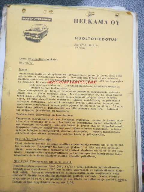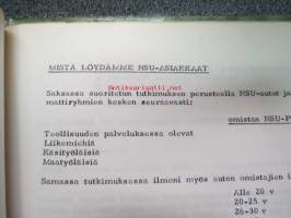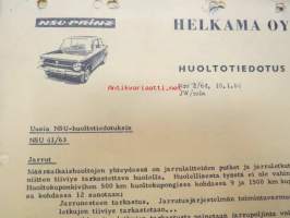 NSU / Helkama Oy:n maahantuomien autojen huoltotiedotuksia, myyntikurssi, varaosahinnasto yms. NSU-autojen maahantuontiin ja jälleenmyyntiin liittyvää, 4 cm nippu