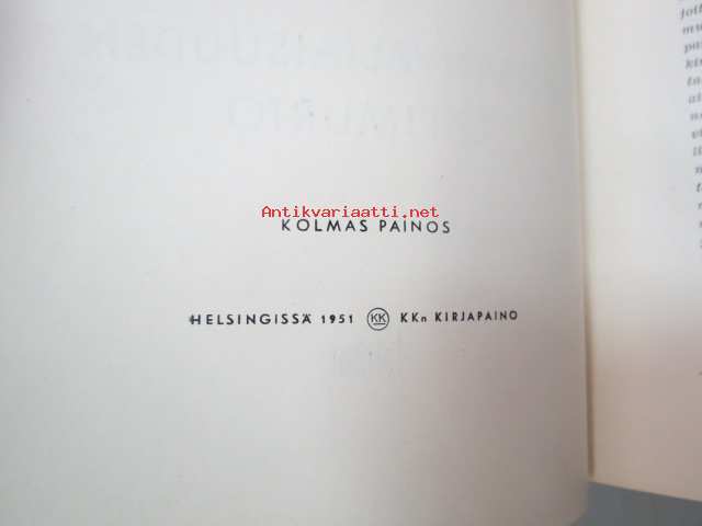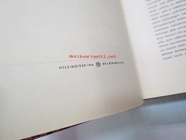 | Saatavilla | 1 kpl | | Julkaisuvuosi | 1946 | | Sivuja | 955 | | Painos | 1. | | Kunto | K3 | | Sidonta/painoasu | Sidottu (kovak.) | | Kielet | Suomi |