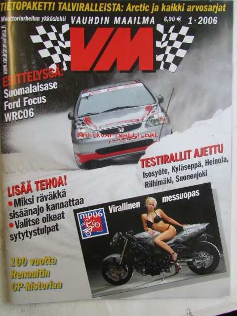 Vauhdin Maailma 2006 nr 1 -mm. Rallin MM-sarjan 2006 sääntöjä, luokkia, kuljettajia. Vuodenvaihteen kotimaiset rallit Isosyöte, Heinola, Kyläseppä, Suonenjoki, Riihimäki. Rallin kotimaiset arvosarjat Yleinen, Nuoret ja Lady Cup, F-ryhmän Cup ja Historic rally Trophy. Jarmo Mikkonen Rallinkonkarin mielipiteitä. F1-maailmanmestari james Hunt elämää isolla vaihteella. Renaultin kilpailuhistoria Osa 1. USA:n ratasarjat -05 Muutakin kuin NASCAR:ia. Pienoisautoilu PA mutta ei kuitenkaa. VM esittelee Ford Focus WRC06, VM Moottoriklinikka sytytystulppa. Helsinki Motor Show Unelmia ja käyttöautoja. Vm maistelee Lexus IS 250, Citroen C1, Opel OPC -mallit, Yamaha MT-01. VM Käyttötesti 50 000km Opel Astra 2,0 GTC Turbo. AMW Dyno service Lappeenrannan tehopenkki. Kilpamoottori sisäänajo Ylimääräisen tehon houkuttelua. MM-kelkkakisa Lahdessa Hiihtostadionilla loikitaan helmikuussa21 x 29 cm.