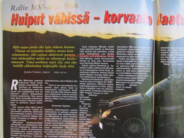 Vauhdin Maailma 2006 nr 1 -mm. Rallin MM-sarjan 2006 sääntöjä, luokkia, kuljettajia. Vuodenvaihteen kotimaiset rallit Isosyöte, Heinola, Kyläseppä,