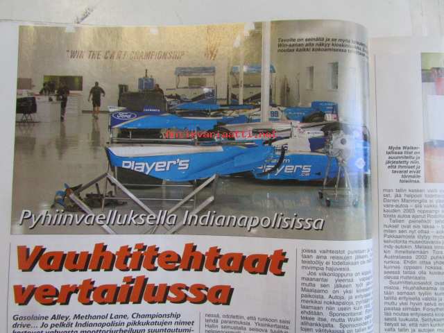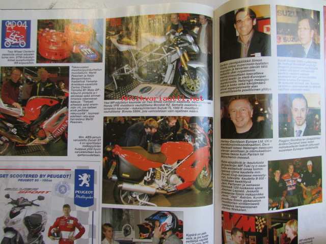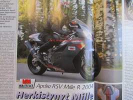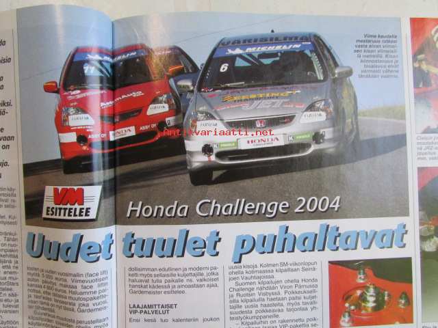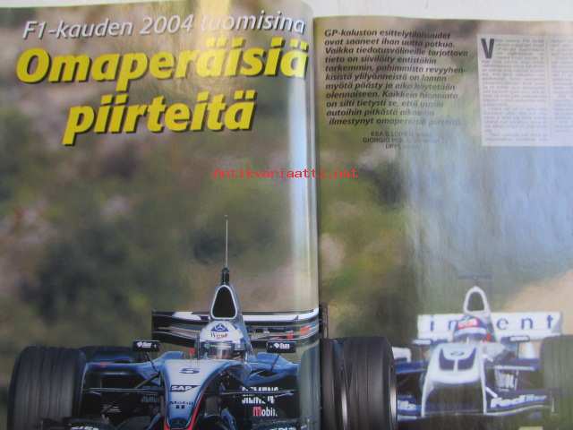 Vauhdin Maailma 2004 nr 2 -mm. Ralli-MM Monte Carlo, Ralli-SM Nuoret & Lady Cup Laukaa, Ralli-SM Rovaniemi, EM Historic Ralli Rovaniemi, Historic Rally Trophy Jämsä, Monster Sport Europe Team, Formula 2004, John Surtees Formula 1 MM, Walker Racing ja Player's Forsyth, Formula V Suomessa osa 4, Euroopan GT-sarjat, VM Maistelee Honda Challenge 2004, VM Moottoriklinikka Renault Clio, VM Maistelee Chysler Crossfire, VM esittelee Porsche Carrera GT, VM Maistelee smart Cabrio Brabus, Moottoriklinikka, MP 2004 näyttely Helsinki, VM Maistelee Aprilia RSV Mille R, Elämäni kisa Arto Kumpumäki.21 x 29 cm.
